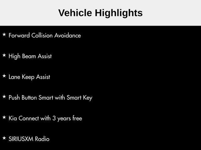 Apply CarPlay & Android Auto, Blind-Spot Collision Warning, Rear Cross-Traffic Collision-Avoidance Assist, Remote Start, Bluetooth®, Backup Camera, Smart Cruise Control w/Stop & Go, Lane Following Assist, Forward Collision Avoidance, High Beam Assist, Lane Keep Assist, Push Button Smart with Smart Key, Kia Connect with 3 years free, SIRIUSXM Radio.