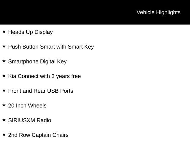 Dual Sunroofs (2nd Row Fixed), Navigation, Apply CarPlay & Android Auto, Surround View Monitor & Blind-Spot View Monitor, 3rd Row Seat, Wireless Charging, AWD, Blind-Spot Collision Warning, Rear Cross-Traffic Collision-Avoidance Assist, Smart Power Liftgate, Leather, Heated and Cooled Seats, Rear Heated and Cooled Seats, Heated Steering Wheel, Remote Start, Bluetooth®, Backup Camera, Smart Cruise Control w/Stop & Go, Lane Following Assist, Forward Collision Avoidance, High Beam Assist, Highway Driving Assist, Lane Keep Assist, Lane Departure Warning, Heads Up Display, Push Button Smart with Smart Key, Smartphone Digital Key, Kia Connect with 3 years free, Front and Rear USB Ports, 20 Inch Wheels, SIRIUSXM Radio, 2nd Row Captain Chairs, Meridian Premium Audio System, 2.5L 4-Cylinder.