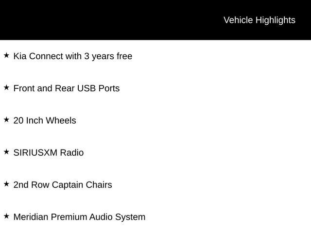 - Radio: 14 Speaker Meridian Audio System -inc: 12.3" center infotainment w/navigation and ccNC, wireless Apple CarPlay and Android Auto, SiriusXM, Bluetooth®, 10" subwoofer, OTA update capability, passenger talk, Wi-Fi hotspot, Kia Connect and 1 data USB-C port