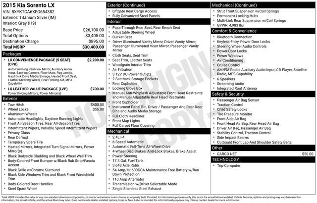 2015 Kia Sorento LX Titanium Silver 2.4L I4 DGI DOHC Dual CVVT AWD 19/25 City/Highway MPG 6-Speed Automatic with Sportmatic
