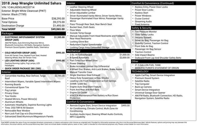 2018 Jeep Wrangler Unlimited Sahara Bright White Clearcoat 2.0L I4 DOHC 4WD 22/24 City/Highway MPG 8-Speed Automatic