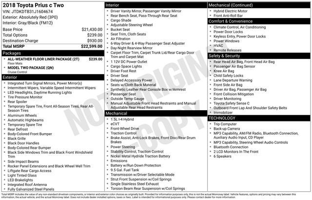 2018 Toyota Prius c Two Absolutely Red 1.5L 4-Cylinder Atkinson-Cycle VVT-i FWD 48/43 City/Highway MPG CVT