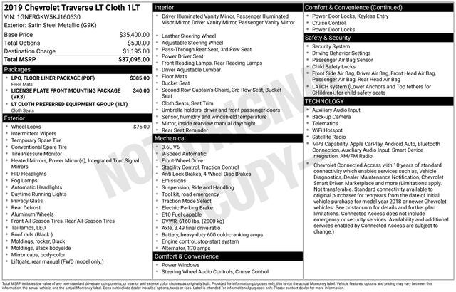 2019 Chevrolet Traverse LT Cloth w/1LT Satin Steel Metallic 3.6L V6 SIDI VVT FWD 18/27 City/Highway MPG 9-Speed Automatic