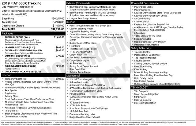 2019 Fiat 500X Trekking Rosso Passione (Red Hypnotique Clear Coat) 1.3L I4 AWD 24/30 City/Highway MPG 9-Speed 948TE Automatic