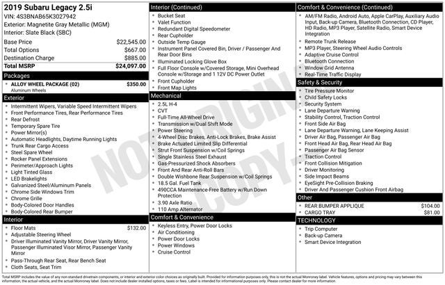 2019 Subaru Legacy 2.5i Magnetite Gray Metallic 2.5L 4-Cylinder DOHC 16V AWD 25/34 City/Highway MPG CVT Lineartronic