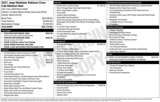 2021 Jeep Gladiator Rubicon Limited Edition Gecko Clearcoat 3.6L V6 24V VVT 4WD 17/22 City/Highway MPG 8-Speed Automatic