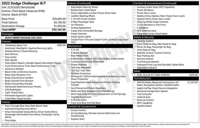 2022 Dodge Challenger R/T Pitch Black Clearcoat HEMI 5.7L V8 VVT RWD 15/23 City/Highway MPG Tremec 6-Speed Manual