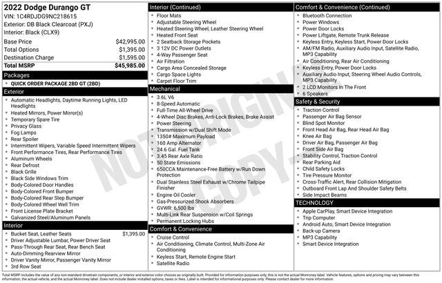 2022 Dodge Durango GT DB Black Crystal Clearcoat 3.6L V6 24V VVT AWD 18/25 City/Highway MPG 8-Speed Automatic