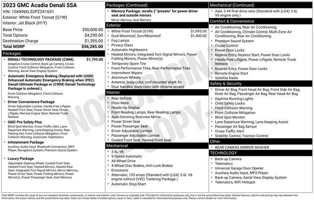 2023 GMC Acadia Denali White Frost Tricoat 3.6L V6 SIDI AWD 19/26 City/Highway MPG 9-Speed Automatic